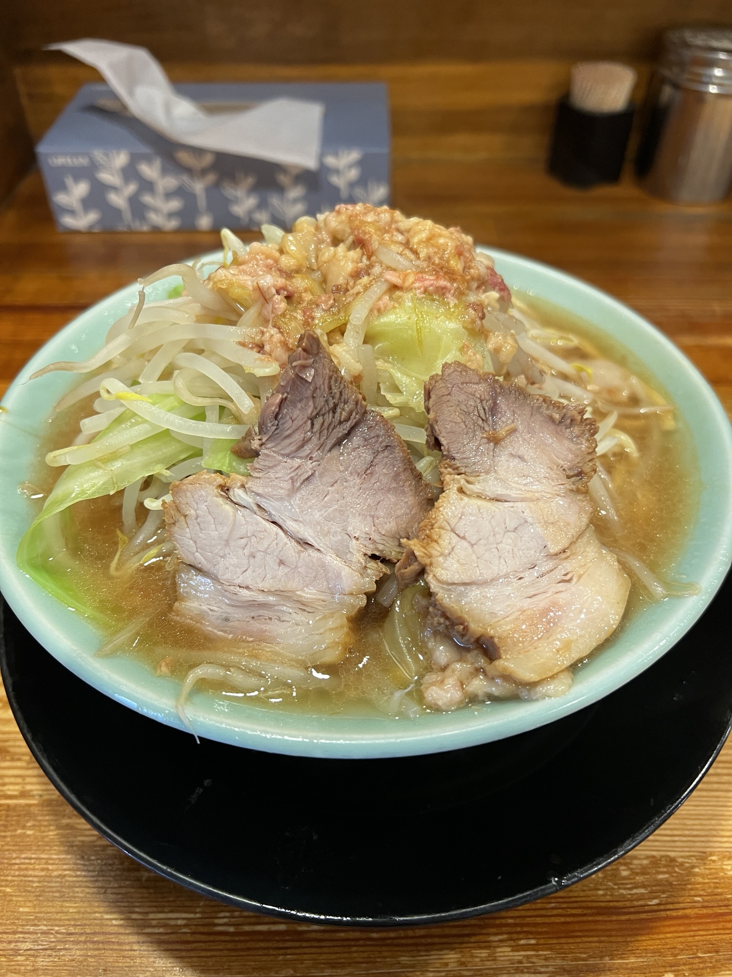 味は野菜増しにするとちょっと薄めに感じますが、その時はテーブルの上にあるタレを使って調整ができます。