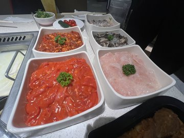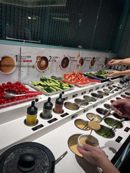 ②つけだれ 面白いのが下の写真、 薬味やタレを自分達で取って作ります。 キノコダレ、黒酢、サーチャージャブ?、などをベースにし、ニンニクやパクチー、すりごま、ネギをかけてアレンジできます。